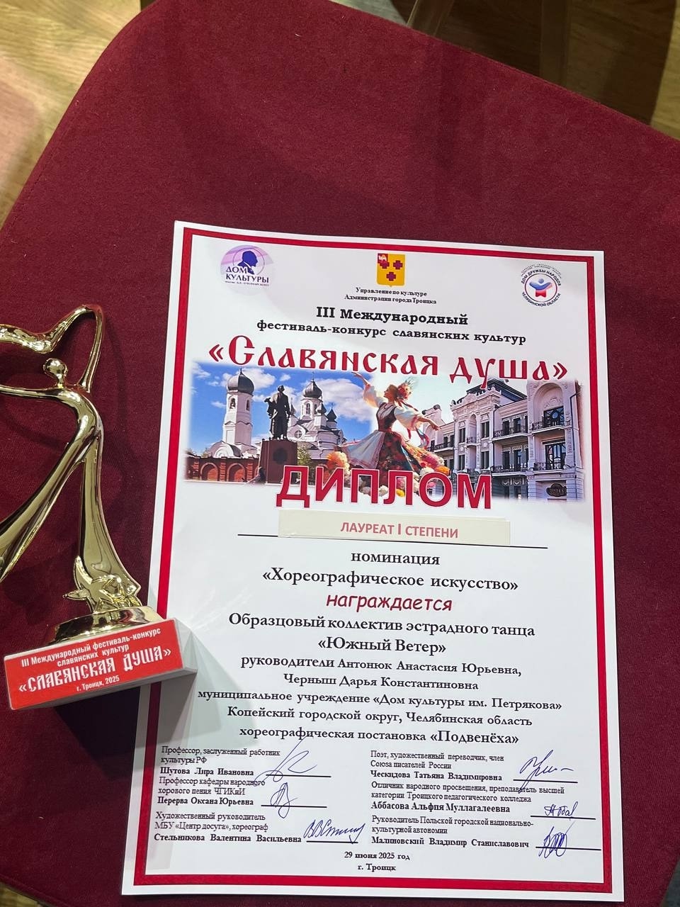 29 июня 2025 года наш Образцовый коллектив эстрадного танца «Южный Ветер» в составе старшей группы отправился в город Троицк, чтобы принять участие в Международном фестивале-конкурсе славянских культур «Славянская душа!